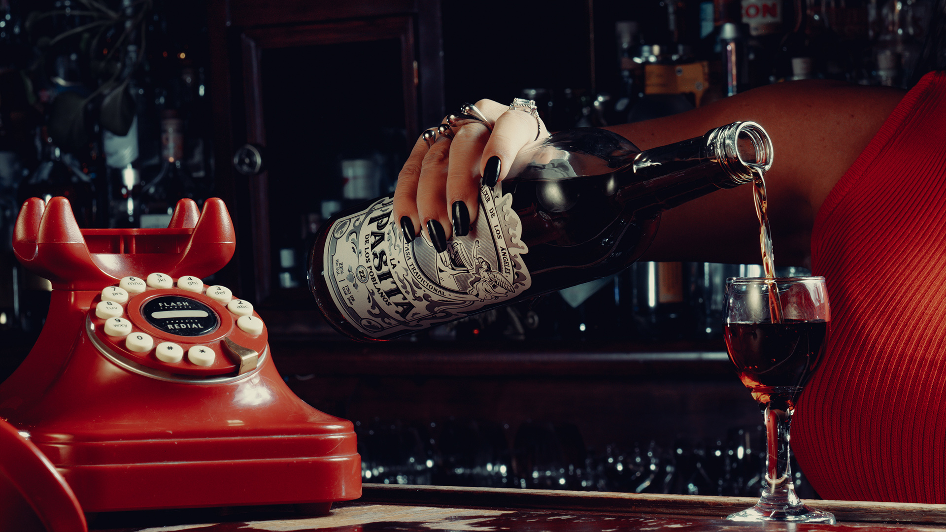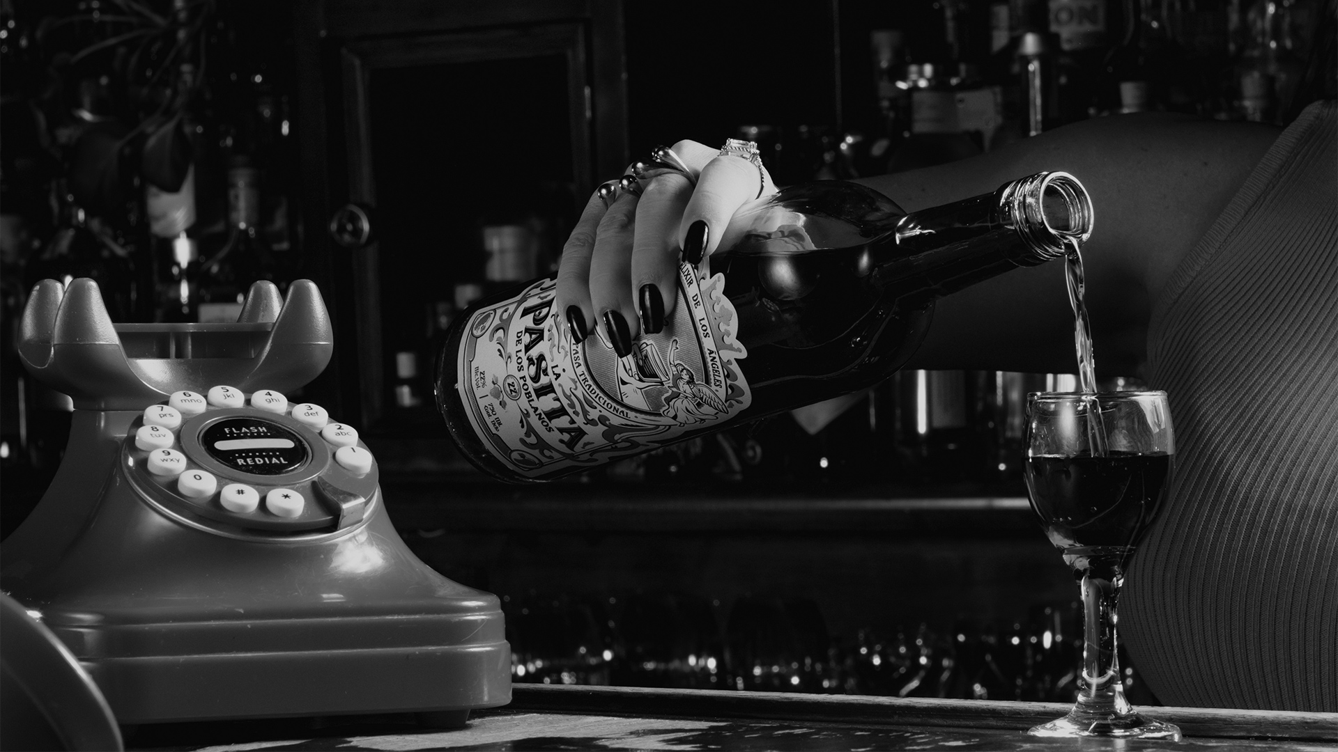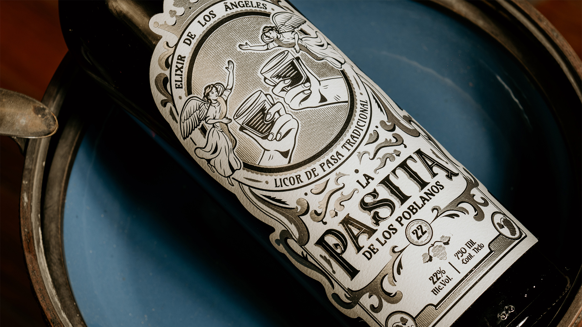 Le système d’étiquetage se distingue par son équilibre et sa clarté. Une vignette centrale représente deux mains trinquant avec un verre de Pasita, accompagnées d’une paire d’anges qui viennent sublimer la scène. La couronne supérieure et les éléments graphiques s’inspirent des ornements classiques du baroque : reliefs floraux rappelant les retables majestueux des églises coloniales. En référence à son caractère vineux, un motif de vigne et de feuilles a été intégré à la composition.
