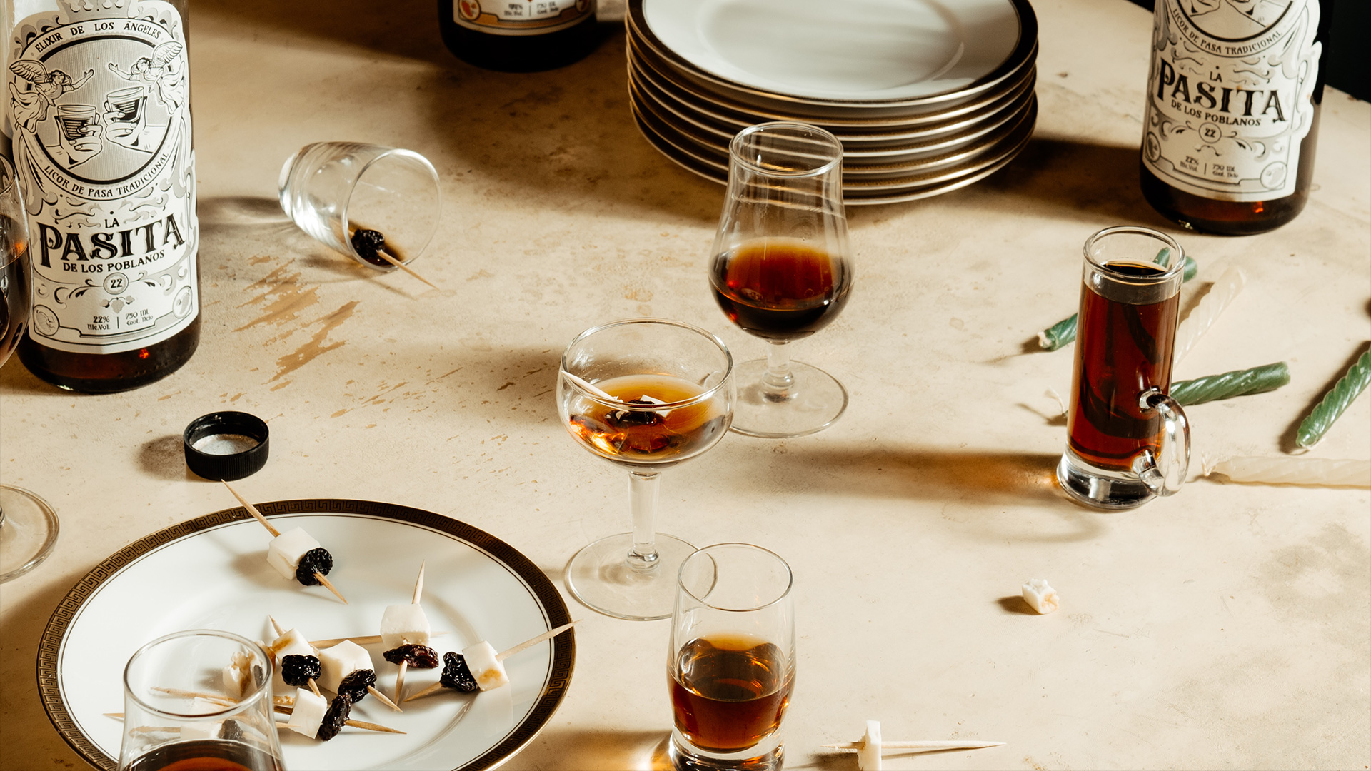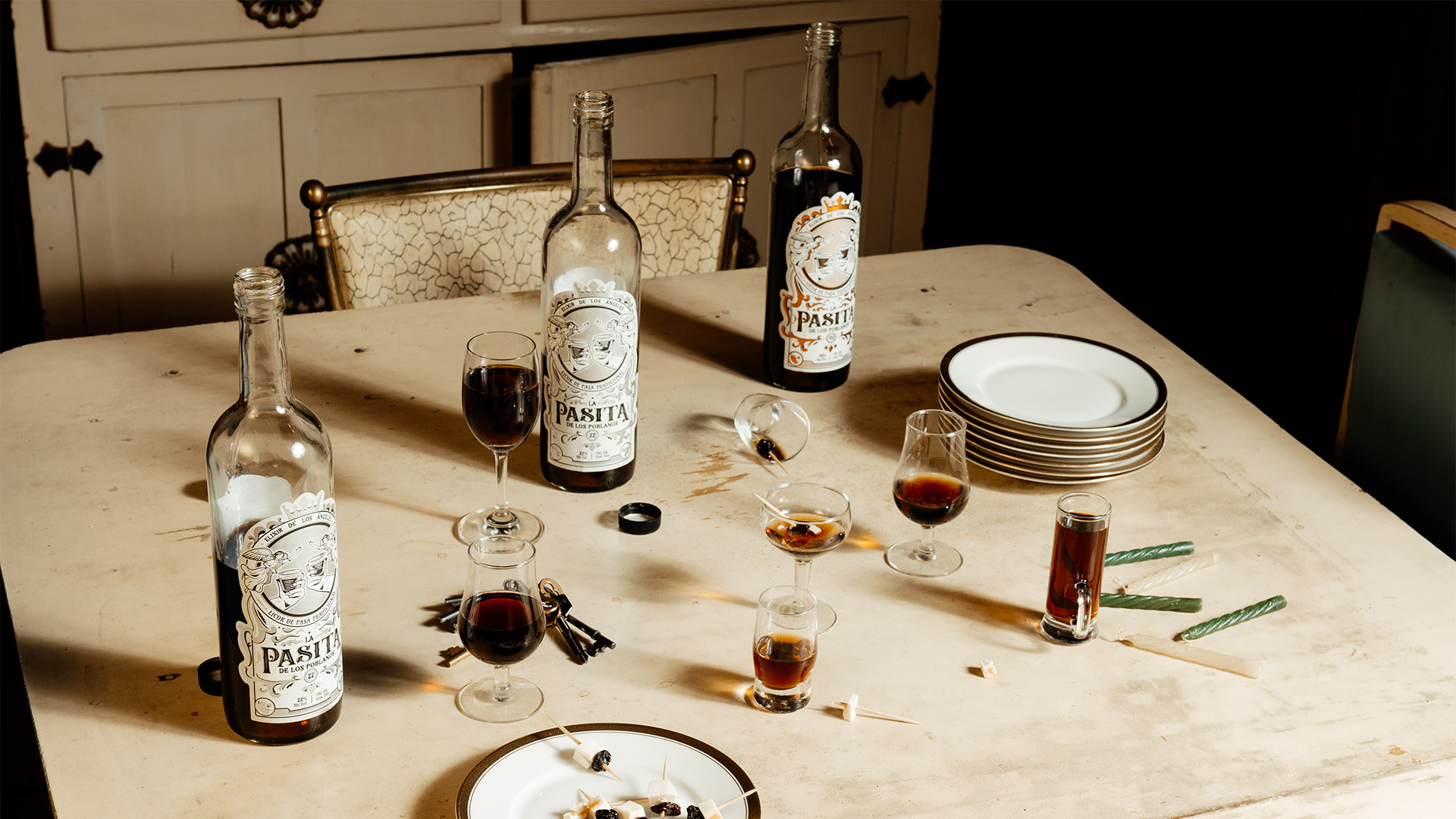 La Pasita de los Poblanos es un licor tradicional elaborado con uva pasa y vainilla, de sabor dulce y tono frutal. Al ser una de las bebidas típicas más características de la sobremesa poblana, desde Abracadabra desarrollamos la identidad de la marca a partir de elementos representativos de Puebla: los ángeles y el barroco. El resultado es una imagen singular, suntuosa y alusiva a la historia de esta hermosa ciudad colonial.