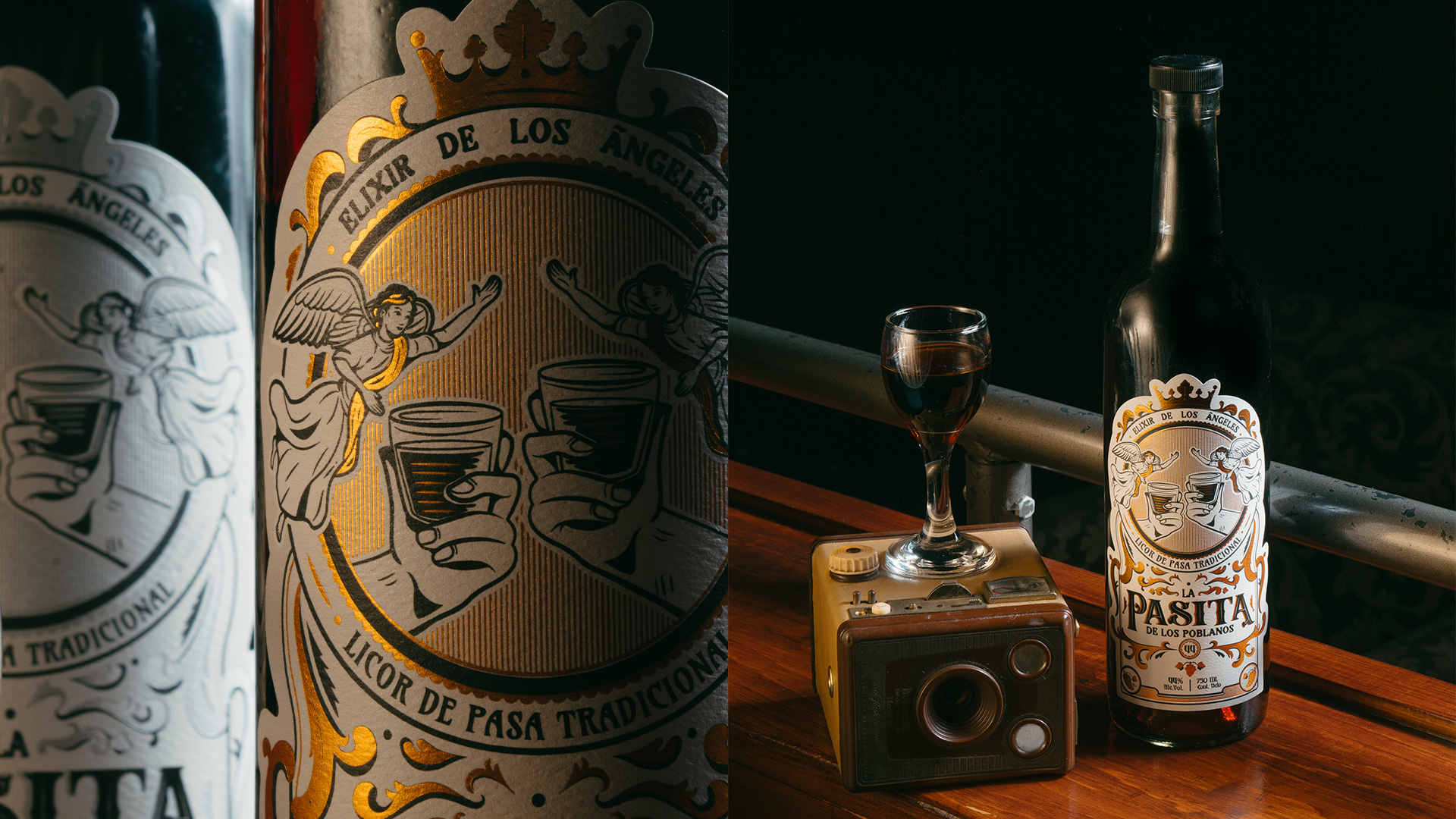 Due to the harmony of its elements, the labelling system is visually clean. A vignette features two hands toasting with Pasita as a pair of angels witness this moment. The graphic elements, as well as the crown placed above, are inspired by classical baroque ornamentation: floral-like reliefs reminiscent of the grand altarpieces found in colonial churches. A grapevine and its leaves were incorporated into the design, alluding to its rich wine-like flavour.