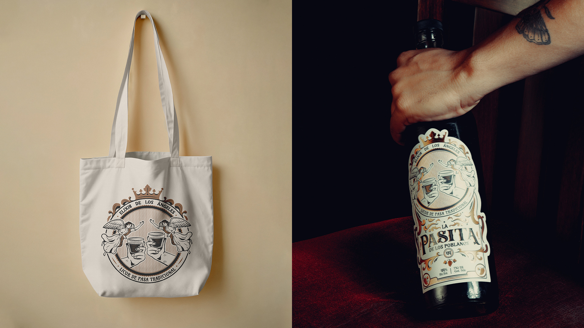 La Pasita de los Poblanos est une liqueur traditionnelle élaborée à partir de raisins secs et de vanille, au goût doux et aux notes fruitées. Boisson emblématique des fins de repas à Puebla, elle occupe une place singulière dans la culture locale. Chez Abracadabra, nous avons développé l’identité de la marque à partir de références profondément ancrées dans l’imaginaire de la ville : les anges et le baroque. Le résultat est une image singulière et somptueuse, empreinte d’histoire et évocatrice de l’héritage de cette ville coloniale.